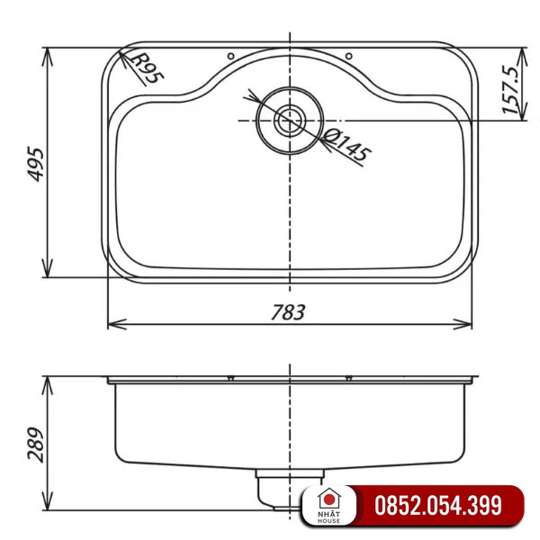 Kích thước lòng chậu 783 x 495 x 200 mm (Rộng x Sâu x Cao)
